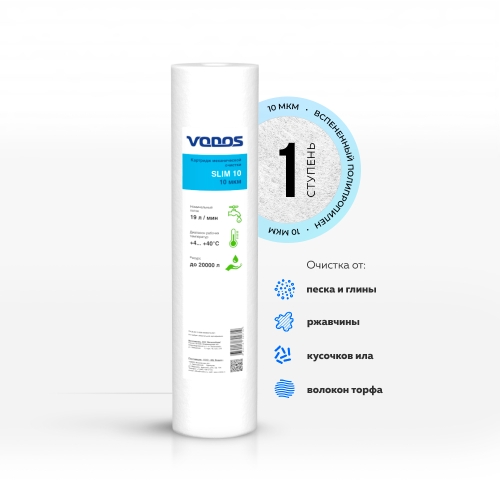 Картридж предварительной очистки механического типа, изготовленный из плотного полипропилена. Обеспечивает удаление не растворимых в воде мелких примесей: ржавчины, кусочков ила, песка, глины, волокон торфа, микроорганизмов.