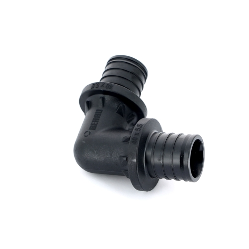 Угол надвижной пластиковый 90 градусов Rehau 40 мм используется для монтажа систем водоснабжения и отопления с трубами RAUTITAN stabil и RAUTITAN flex при разном диаметре труб при необходимости изменения направления трубопровода в системах холодного и горячего водоснабжения, системах отопления. Фитинг оснащен специальными центрирующими выступами. Выполняется из PPSU (полифенилсульфон) черного цвета. Максимальная рабочая температура для фитинга составляет +95 оС, максимальное рабочее давление – до 10 бар. В связи со специально разработанной конструкцией, фитинг не снижает внутреннее давление.